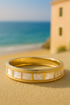 Drawn like the soft trace of morning sunlight across the sand, Linea di Luce is a minimalist ode to elegance. The gentle curve of lustrous mother-of-pearl, framed in polished gold and held by twisted rope-like strands, reflects the rhythm of coastal calm and architectural grace.